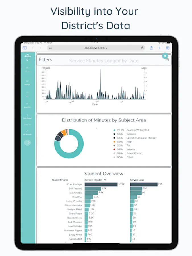 Looking for a way to document service minutes for students? Tired of pen and paper documentation? Brolly understands it can be difficult to ensure all students are receiving the number of service minutes outlined in their Individualized Education Plans (IEP). Our app helps make this process easy!