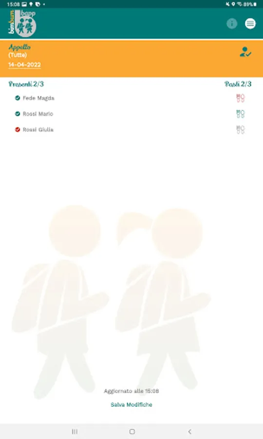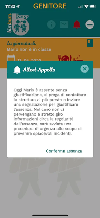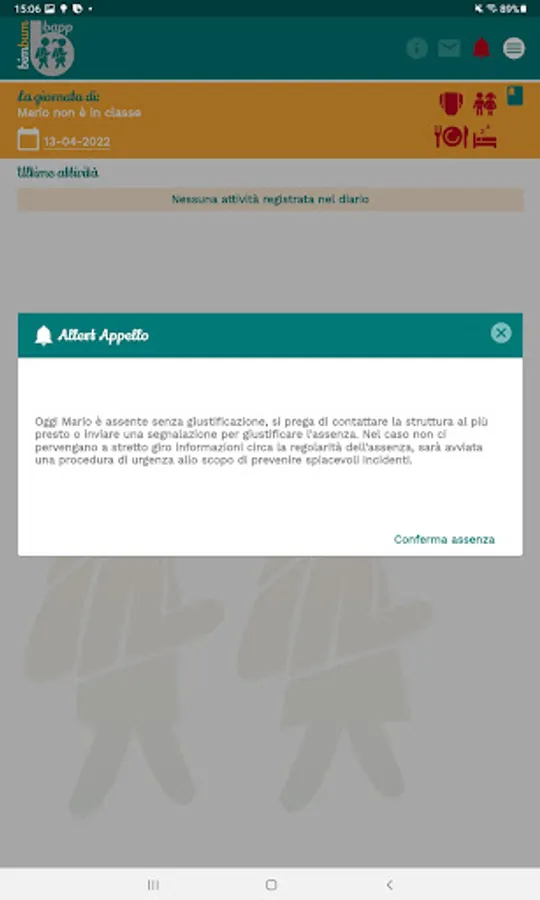 The alarm function on the daily call sends a notification in case of absence not previously justified, in order to alert the parent and avoid unpleasant incidents.