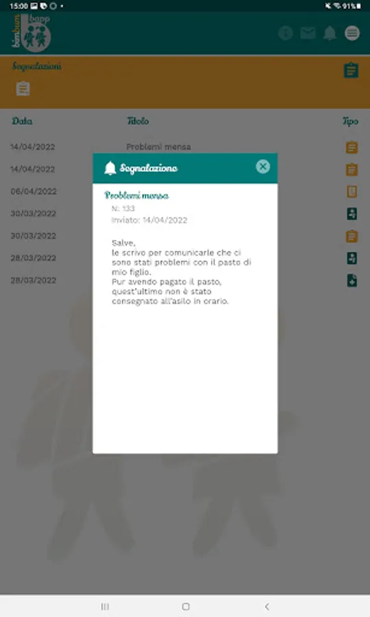 4. Ticket opening, or reports sent by parents to the Structure that are presented to Operators, confirming their acknowledgment.