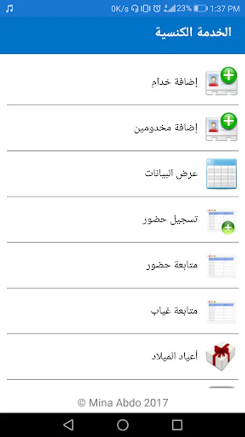 يساعدك هذا البرنامج على تسهيل متابعة الخدمة الكنسية من خلال تليفونك عن طريق تسجيل بيانات الخدام والمخدومين وتسجيل ومتابعة الحضور.