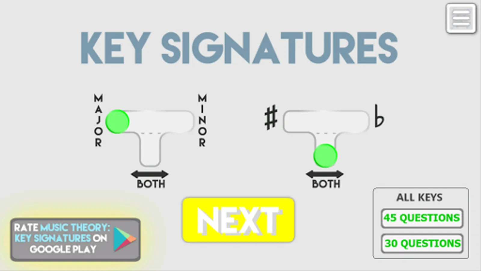 1. All grades of music theory (7 sharps, 7 flats, major and minor keys) are covered in short practice tests of 15 or more questions from the following key signature categories: