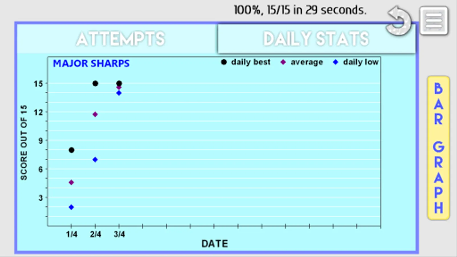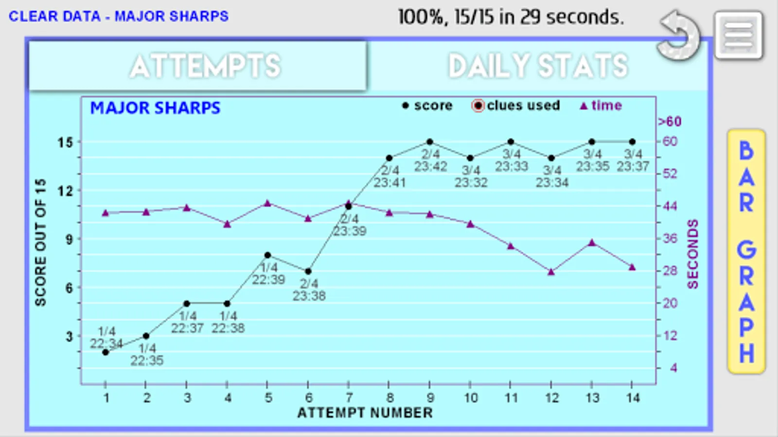 3. Each key signature quiz you do is saved and plotted on a line graph. This will help you to monitor your key signature music theory progress over time and improve your results and study patterns. Date, time of day, and time taken, are recorded for up to 42 attempts in each key signature category (you can clear data separately for each category if needed).