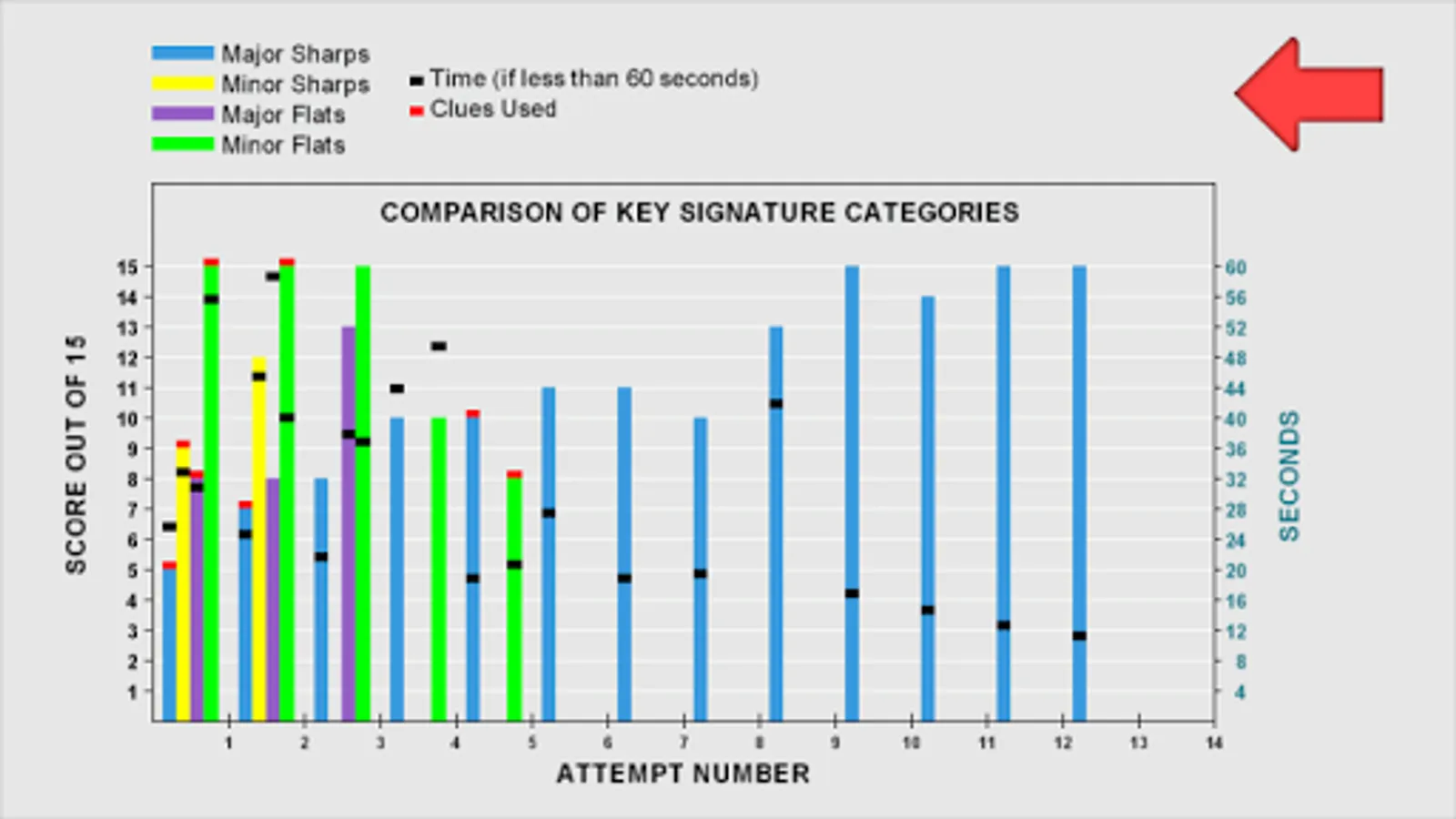4. A bar graph compares your results from the four main key signature categories - major sharps, minor sharps, major flats and minor flats. Once you have achieved high scores, with quick recall (time taken) in these four categories try mixed categories such and major and minor sharps, finally building up to quizzes of 30 or 45 questions covering all key signatures.