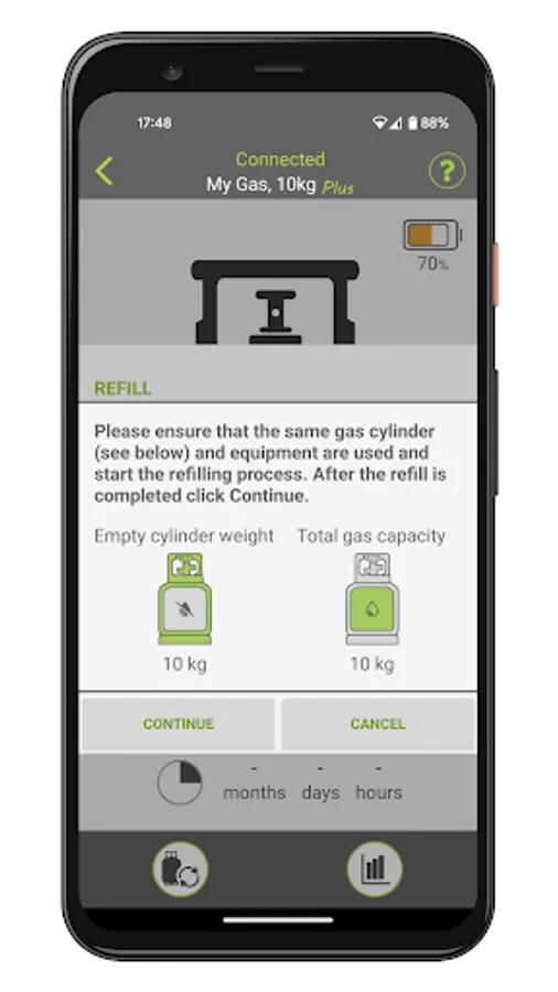 The app calculates when you will most likely run out of gas based on a state-of-the-art numerical procedure. This provides an accurate and reliable estimation of time when the gas cylinder will be empty.