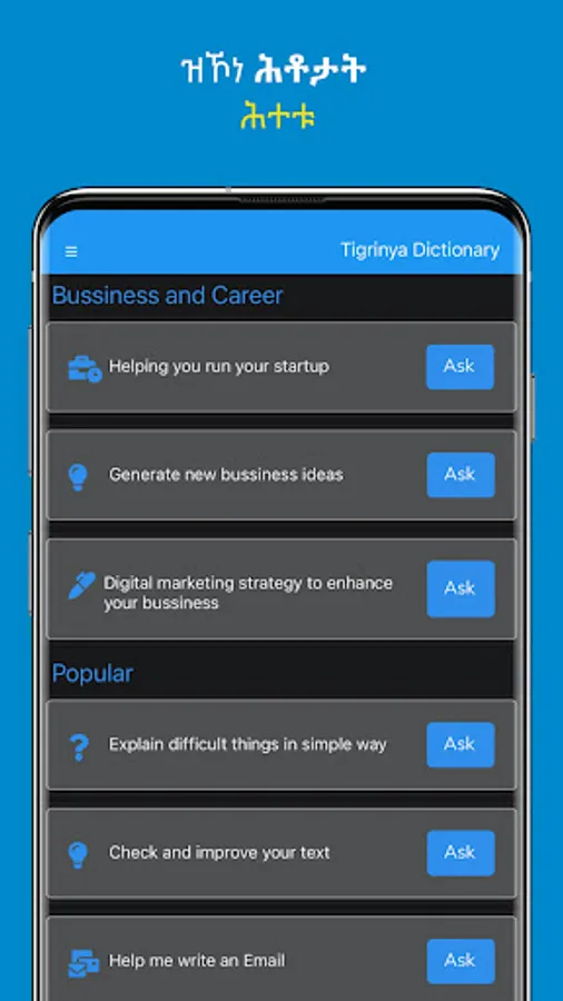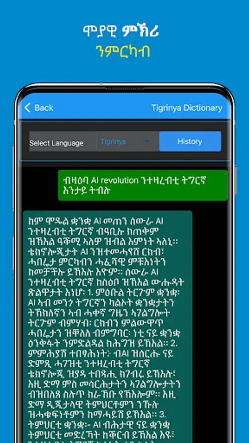 Tigrinya Dictionary app has now included the AI chat in Tigrinya where you will be able to get instant answers, professional input, tailored advice and learn new things.