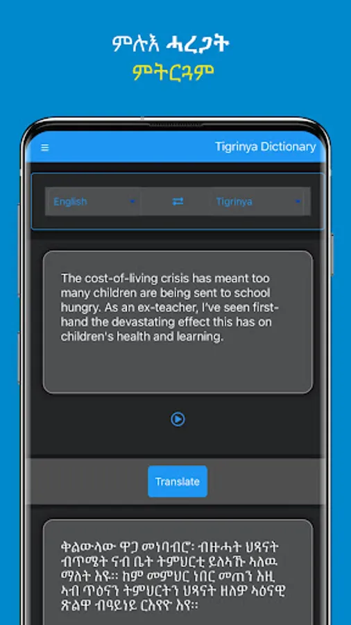4: You can translate full sentences and define words between Tigrinya, English, Spanish, French, German, Italian, Swahili, Arabic and Amharic.