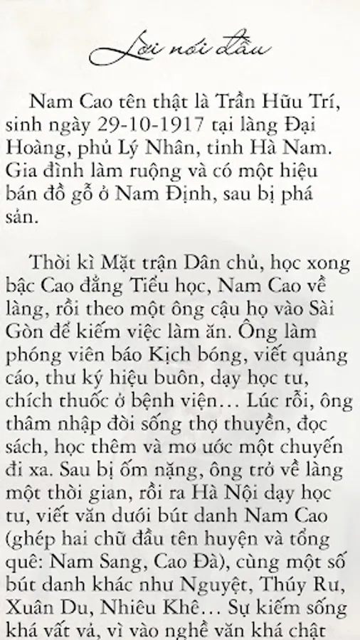 Nam Cao's literary life is not long. Over ten years of writing in both the periods before and after the Revolution, Nam Cao has left many valuable works. As the years passed, Nam Cao's works increasingly showed new qualities and new values. We love him more and more, an honest and beautiful soul in life as well as on the page, a writer, a soldier with the true meaning and completeness of this title.