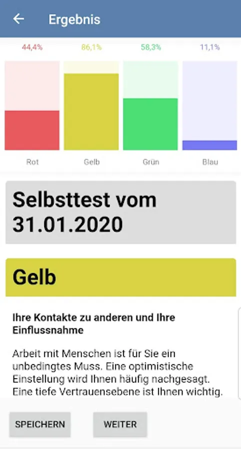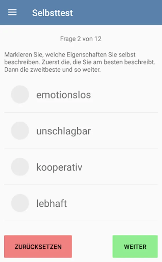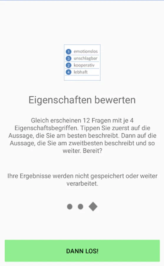 In the self-test, you put some property terms in order and the test results of the app tell you how to deal with problems and challenges, how to design contact with others, how you work and how you deal with structures and rules.