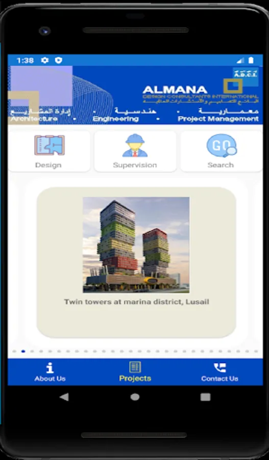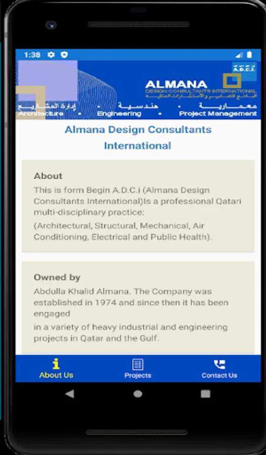 A.D.C.i (Almana Design Consultants International) is a professional Qatari multi-disciplinary practice (Architectural, Structural, Mechanical, Air Conditioning, Electrical and Public Health) owned by Abdulla Khalid Almana. The Company was established in 1974 and since then it has been engaged in a variety of heavy industrial and engineering projects in Qatar and the Gulf.