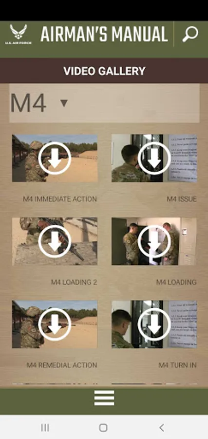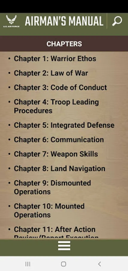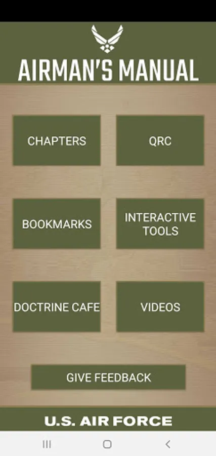 The U.S Air Force Airman's Manual mobile application includes 24 chapters of U.S. Air Force applicable information, ability to bookmark chapters and highlight text, as well as access to Quick Reaction Checklist, U.S.A.F. doctrine and videos. This application also allows the Airman to provide feedback.