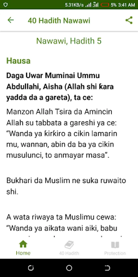 • Complete Arba’una Nawawi (42 Hadith) that consist of three languages namely: Arabic, English and Hausa.