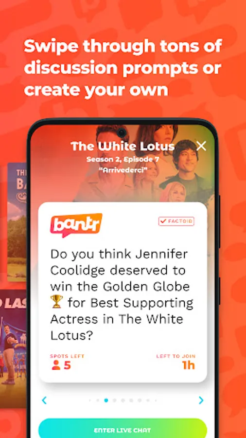 Let’s talk TV! Bantr is a social network for television fans. Comment, rant, commiserate, bond, and bantr about the shows you love with other fans who love them, too. Swipe through episode-specific discussion topics and join small group conversation or create some prompts of your own and get bantring.