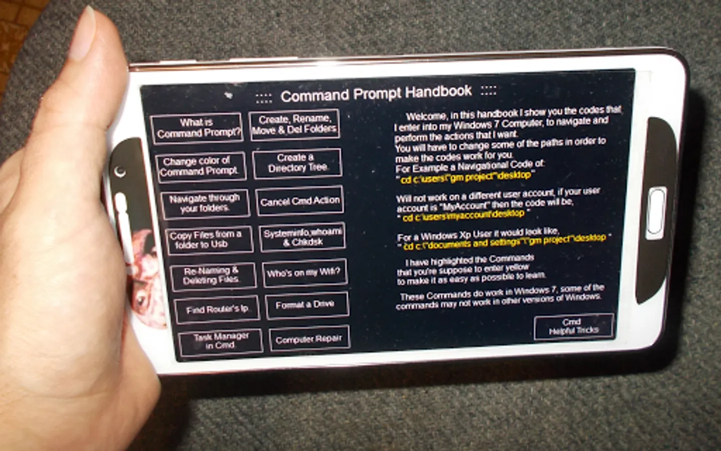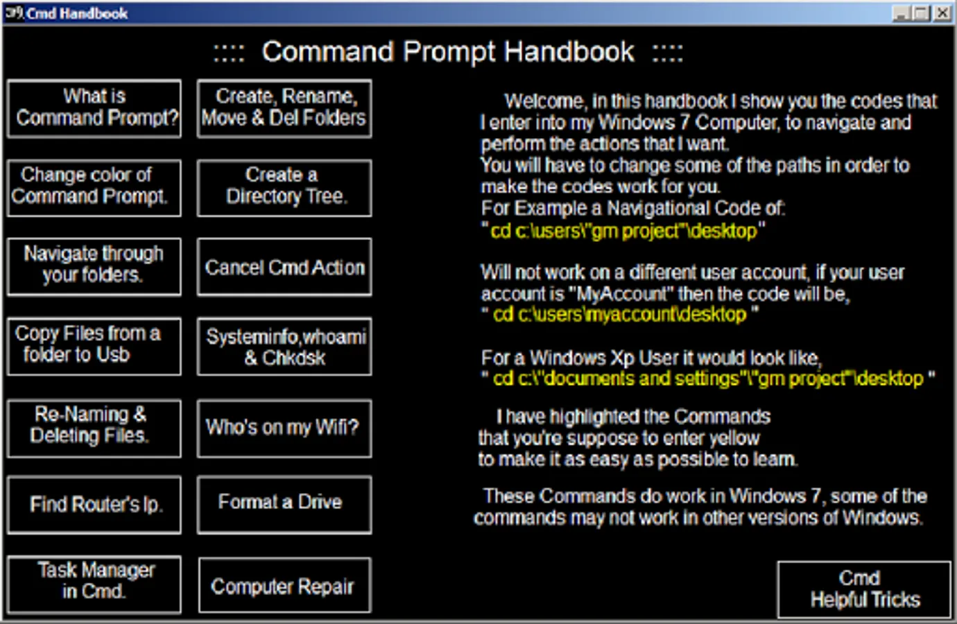 Cmd Codes that I use to navigate and perform tasks on my Windows 7 Computer. After learning what is in this handbook, you should be able to navigate with ease in the Command Prompt, and perform other tasks such as,