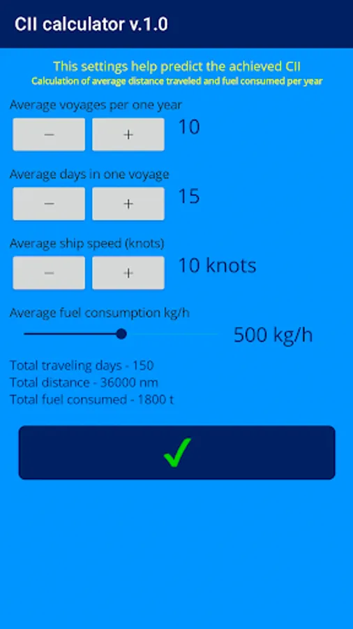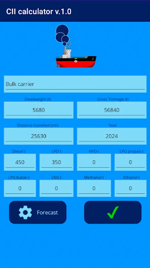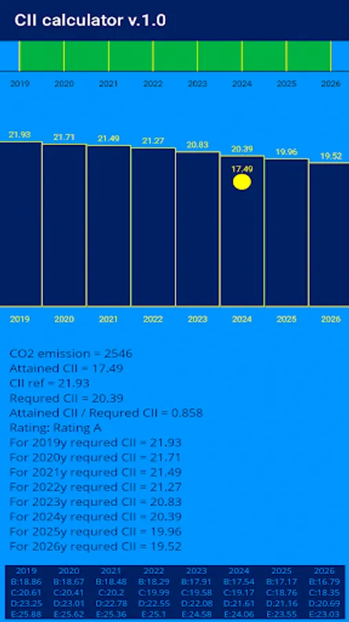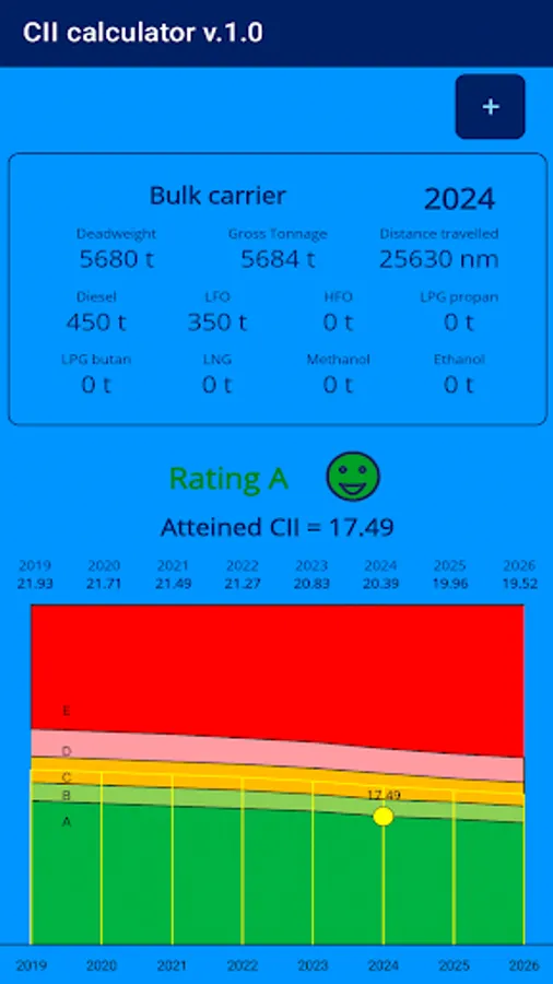 Our application allows you to quickly calculate the CII coefficient and determine which energy efficiency category the ship belongs to (A, B, C, D, E).