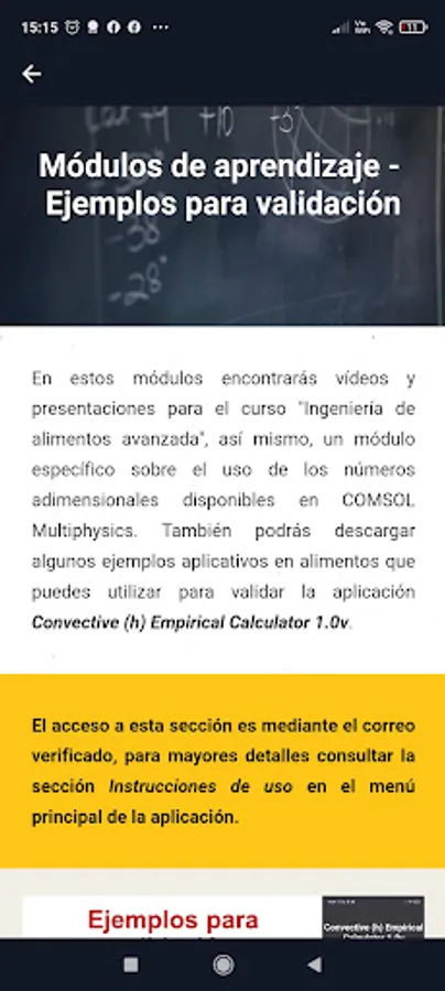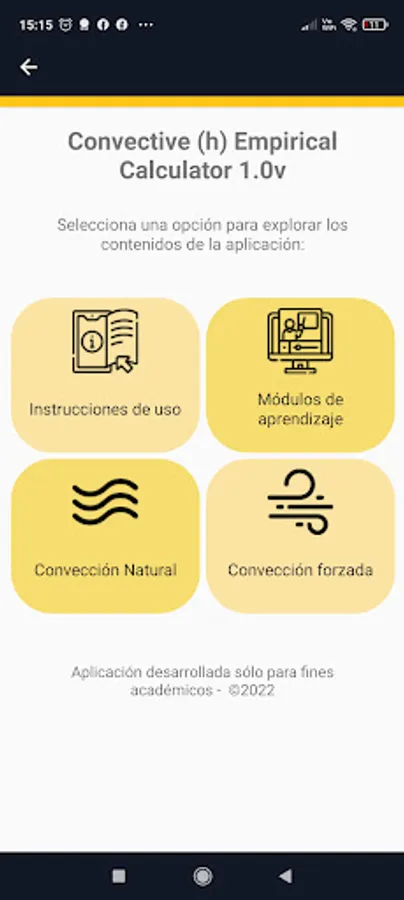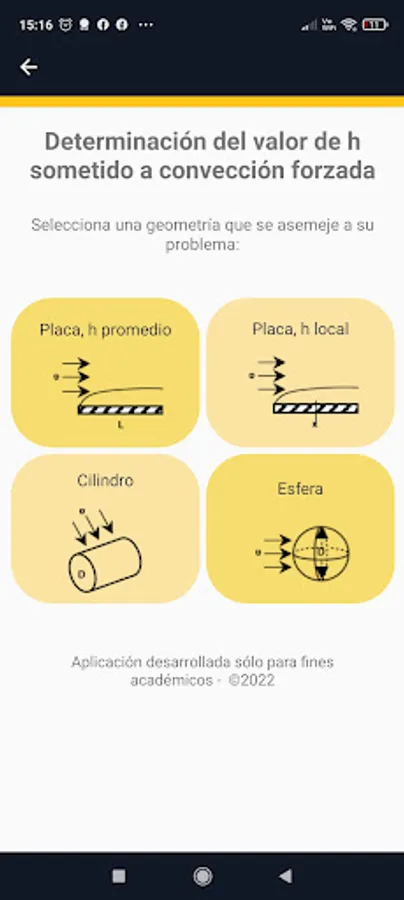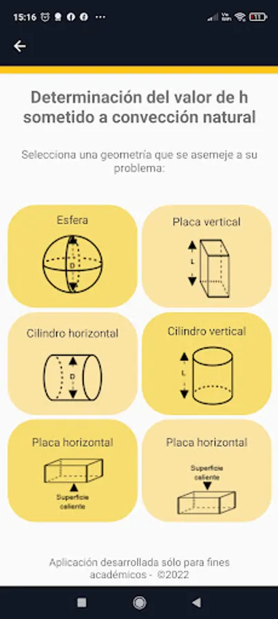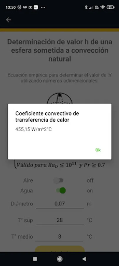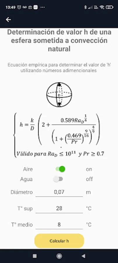 The application has the options to determine the value of h (W/m^2°C) of regular geometries subjected to natural convection or forced external convection. The advantage of the application is that it has predictive models to determine the thermal properties of air and water, which are the typical fluids used to cool or heat food.