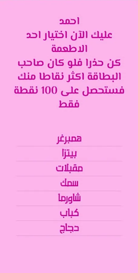Whoever gets the "I'm hungry" card will show him a list of the foods that you entered at the beginning of the game, but he will not know who the player who got this food is, and then he must choose one of the foods to eat