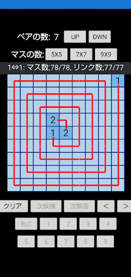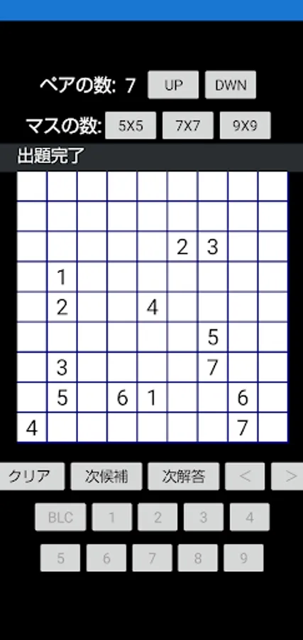 * "Automatic question" automatically creates a puzzle when you tap the "Create" button when nothing is displayed on the board. If necessary, set the number of vertical and horizontal squares and the number of number pairs before creation. The number of pairs is set with the "UP" and "DOWN" buttons at the top of the screen, and the number of squares is selected from three buttons: 5x5, 7x7, and 9x9. Creating a puzzle takes time as the total number of squares increases. In that case, tap the "Cancel" button (same as "Create") and try again. When you finish creating, the specified number of number pairs will be displayed on the board and you will be in answer mode.