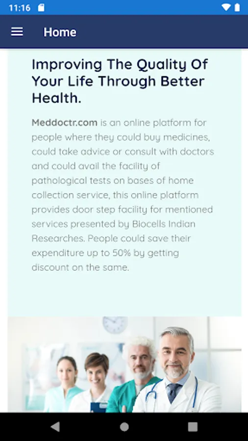 Meddoctr.com is an online platform for people where they could buy medicines, could take advice or consult with doctors and could avail the facility of pathological tests on bases of home collection service, this online platform provides door step facility for mentioned services presented by Biocells Indian Researches. People could save their expenditure up to 50% by getting discount on the same.