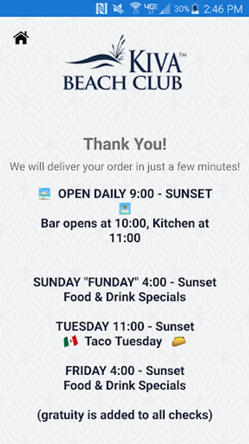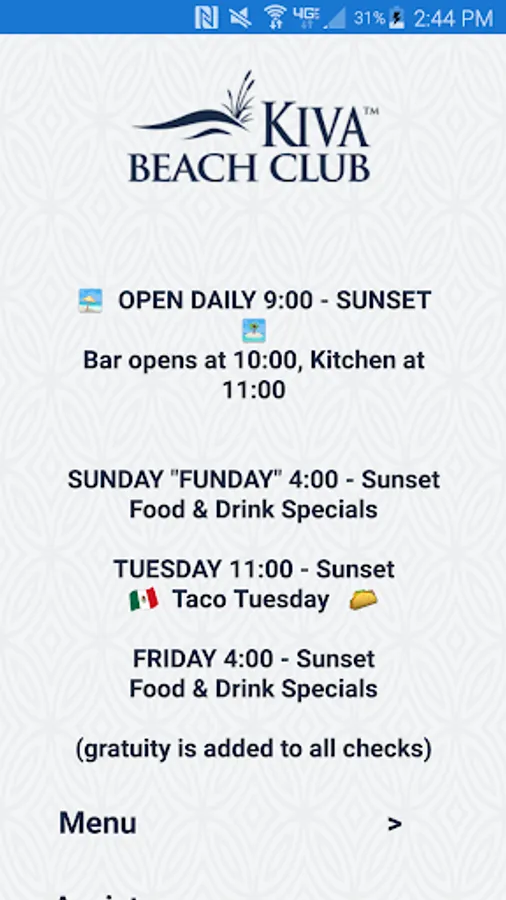 When you stay at Kiva, you are pampered in every way. Order your snacks, drinks, and meals straight from this app and we'll bring it out to you on the beach! No more hassles of leaving your spot in the sun.