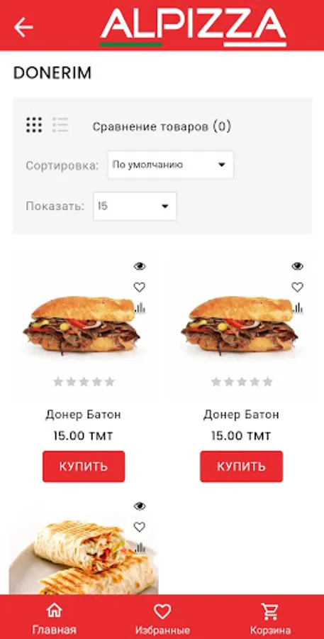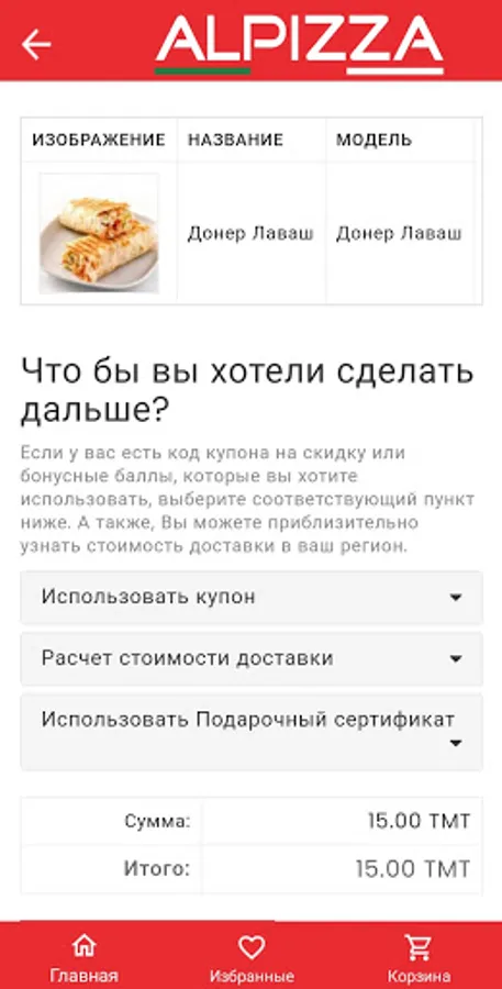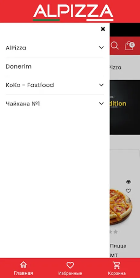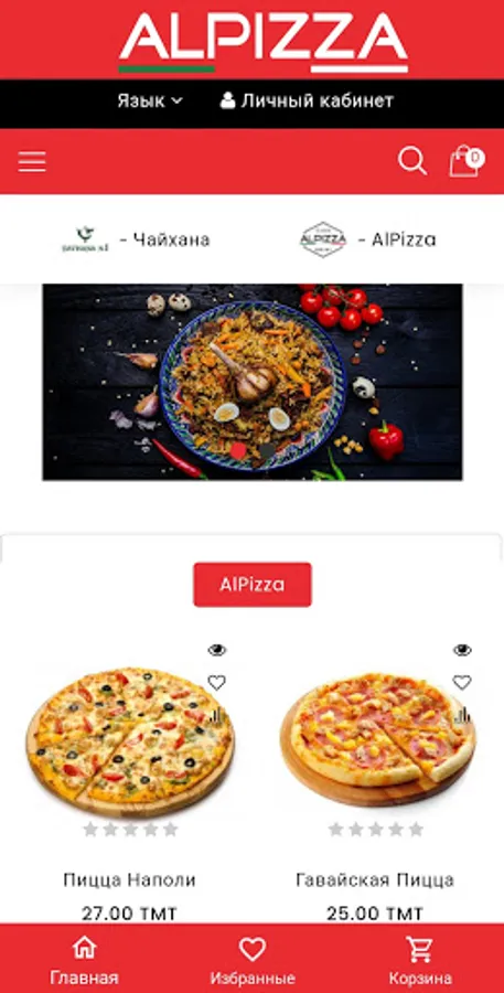 Delivery of ready meals to Turkmenabat. The assortment is presented by restaurants: AlPizza, Çaýhana №1, Dönerim, KoKo.