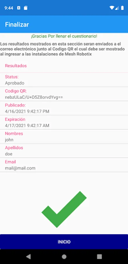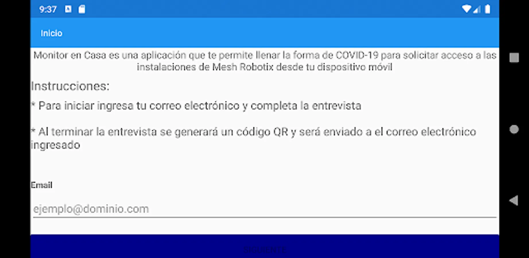 Esta es una aplicación realizada con el motivo de solicitar acceso a las instalaciones de alguna institución u organización contestando un formulario de encuesta en relación a los sintomas del COVID 19