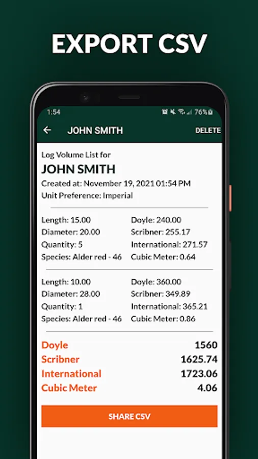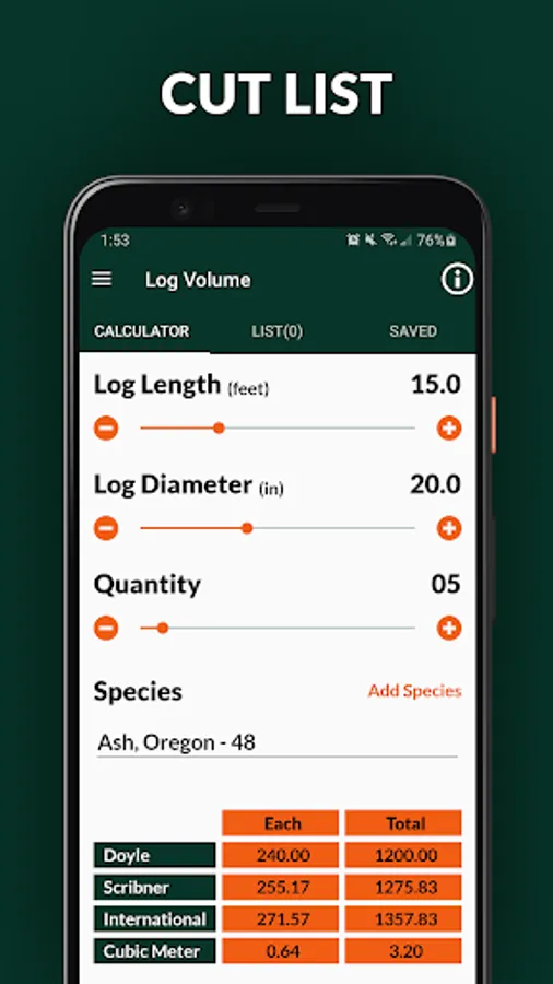 Log Volume (Advanced) has the same features as Log Volume with the ability to create lists of the logs of the logs that are measured. Species has also been added so that you can not only track the volume of each log but also the species. The lists can then be easily exported.