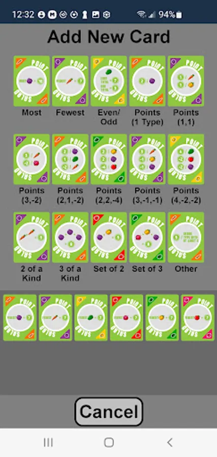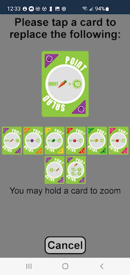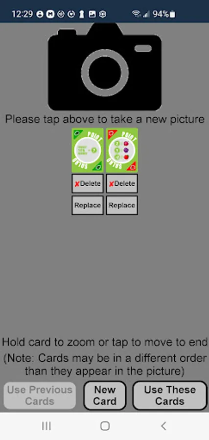 You will notice 2 buttons below each card (Delete & Replace). The Delete button will remove that card from the list (you can always readd it again later). The Replace button will display a list of similar cards (for example, the Most Carrots card to replace the Fewest Carrots card). If you need to add a card that is completely missing from the results or is not listed on the page displayed by the Replace button, you can click the New Card button at the bottom of the screen. This will display a screen with different categories of cards. Click one of these categories to display cards of that type, and click the one you want to add. While editing the results, you can (if desired) move a card to the end of the list by tapping it (this can sometimes make it easier to compare your cards to the ones found by the camera). You can also hold a card to see a zoomed in version (the hold to zoom feature is also available on all other screens that display cards).