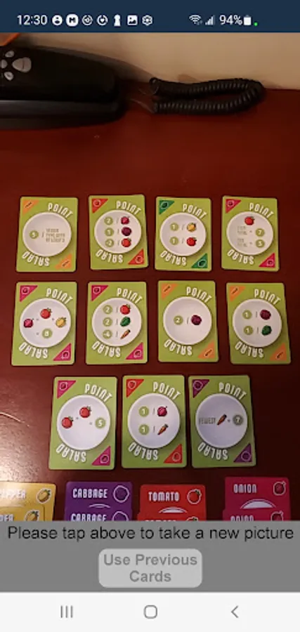 The picture taken with your camera is only for the Goal cards, so it is not necessary to include the Vegetable cards when taking the picture. When taking the picture, it is best to (when possible) avoid glare. I have found that holding your phone parallel to the table can help in doing this.