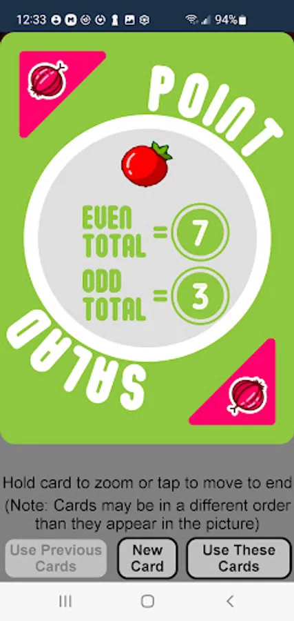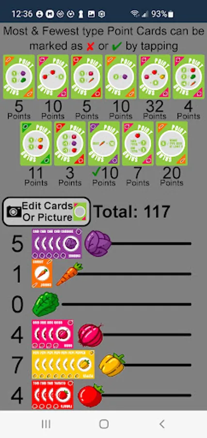 After confirming that you have the correct Goal cards, click the Use These Cards button. You can specify the number of each Vegetable card by using the sliders at the bottom of the screen (if the slider is a 0 and does not seem to work, touch slightly to the right to start sliding). Cards that are based on other player's Vegetable cards (the Most & Fewest cards) can be tapped to mark them as Achieved or Failed. Scores for both individual cards & the total are dynamically updated when you slide the sliders and/or tap the Most & Fewest type cards. To take a new picture or edit your current cards (or calculate the score for another player), you can tap the Edit Cards Or Picture button.