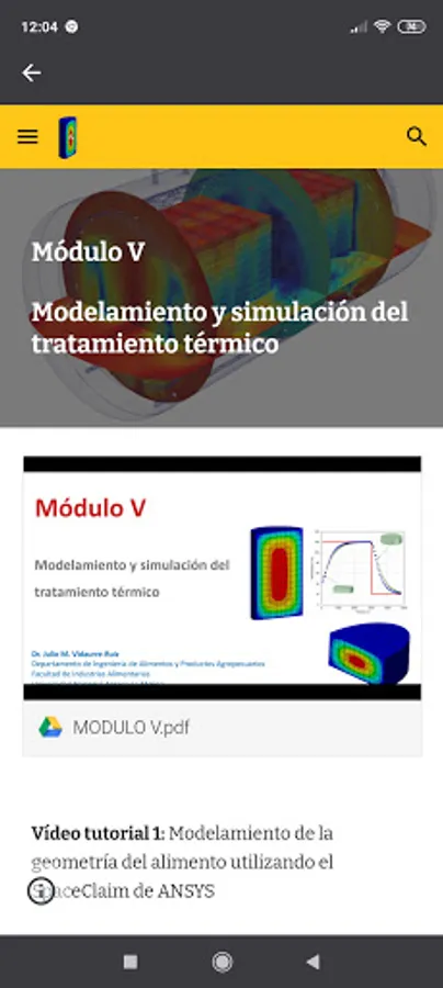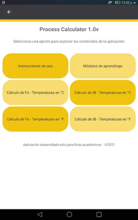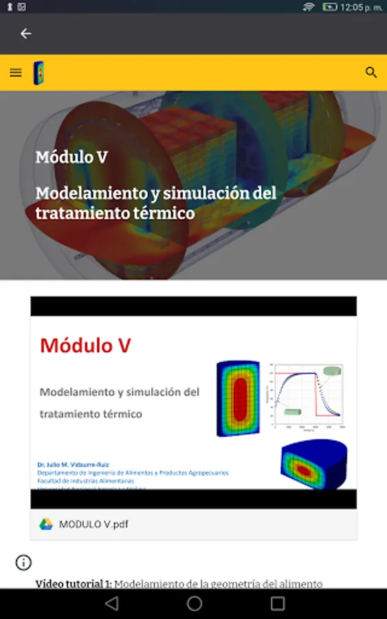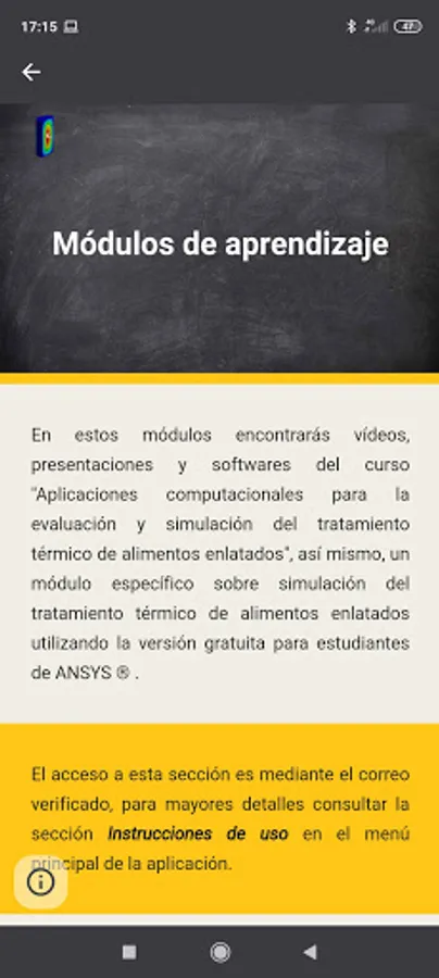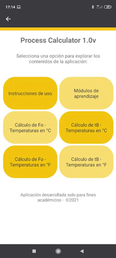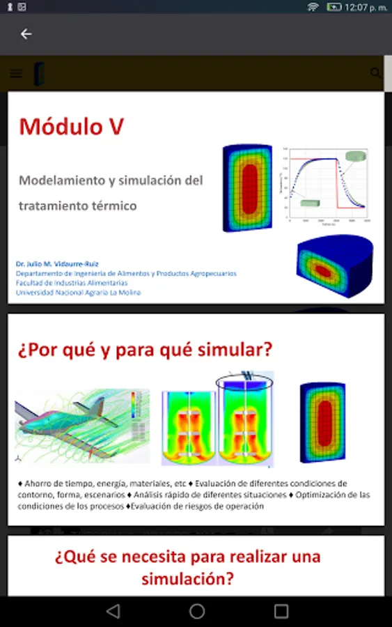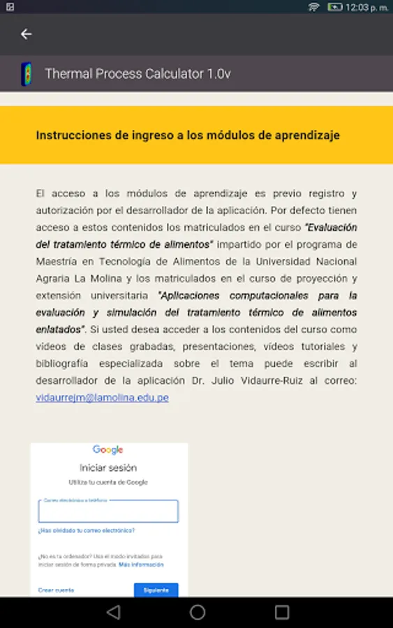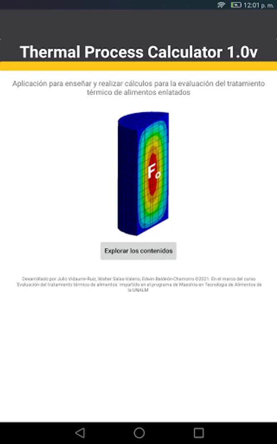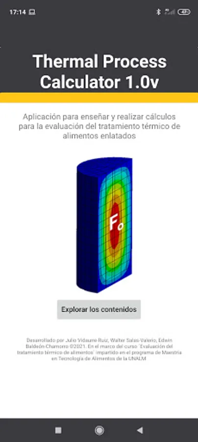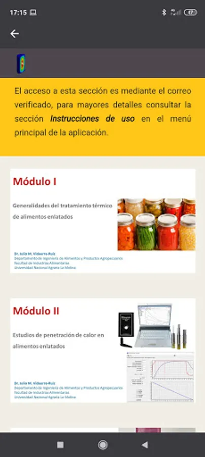 On the other hand, the application also contains Learning Modules on heat treatment of food. These modules are free access for students enrolled in the course: "Evaluation of the thermal treatment of food" of the Master in Food Technology of the National Agrarian University La Molina and those enrolled in the extension and social projection course "Computational applications for the evaluation and simulation of the heat treatment of canned foods ".