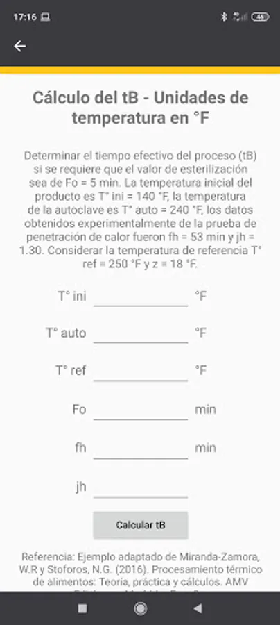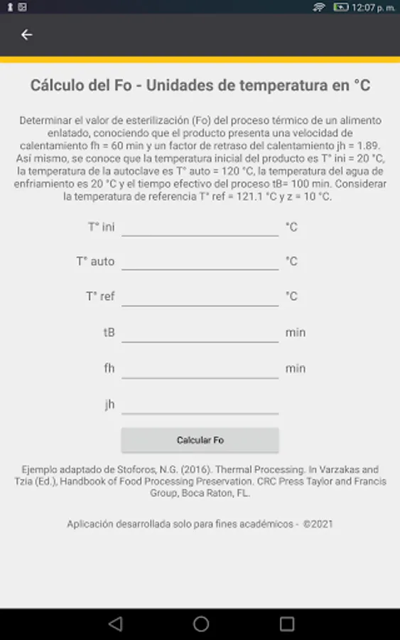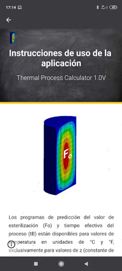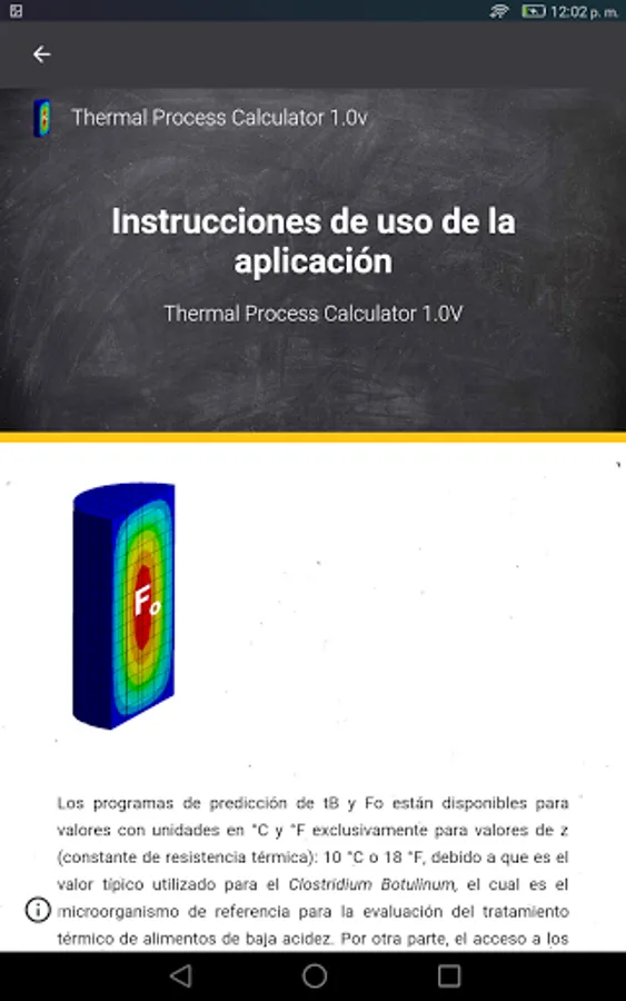 Application to teach and perform calculations for the evaluation of the heat treatment of canned foods. The application contains prediction programs for the sterilization value (Fo) and the effective process time (tB) using the Charles Olin Ball formula method. The programs are available for temperature values in units of ° C and ° F, exclusively for values of z (thermal resistance constant): 10 ° C or 18 ° F, because it is the typical value used for Clostridium Botulinum, which is the reference microorganism for the evaluation of the heat treatment of low acid foods.