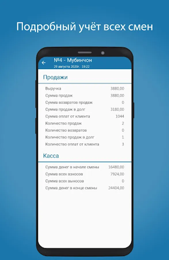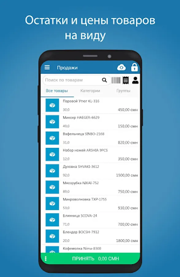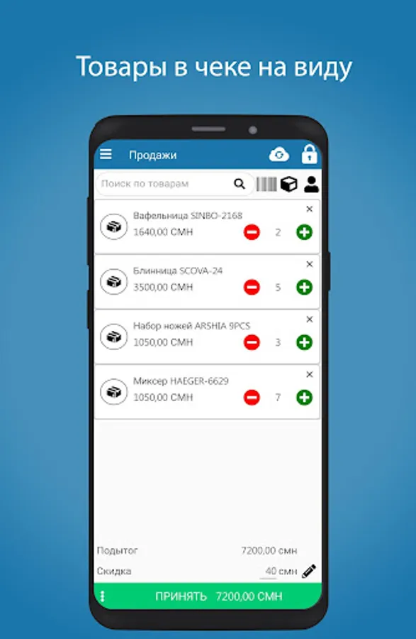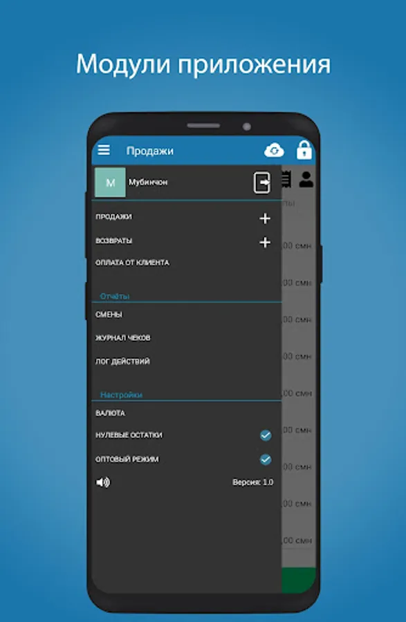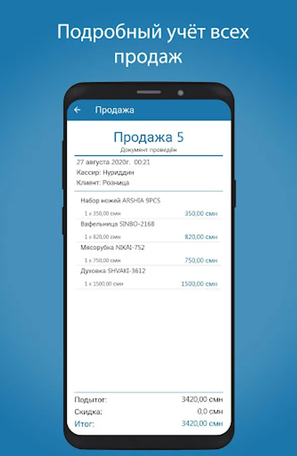 Savdo + Cashier: only the most necessary modules for cashiers. Making sales and returns is now much easier and faster. You can work without the Internet. After connecting to the Internet, the data is synchronized with the Savdo + service.