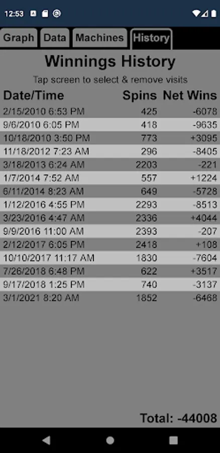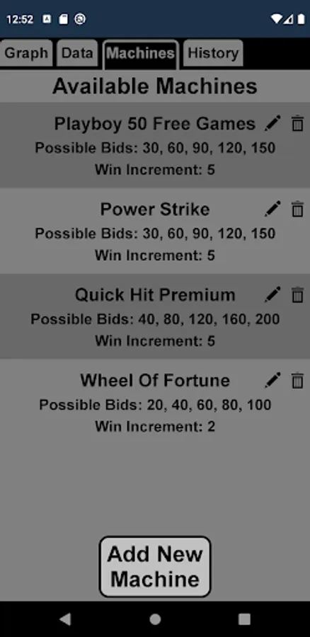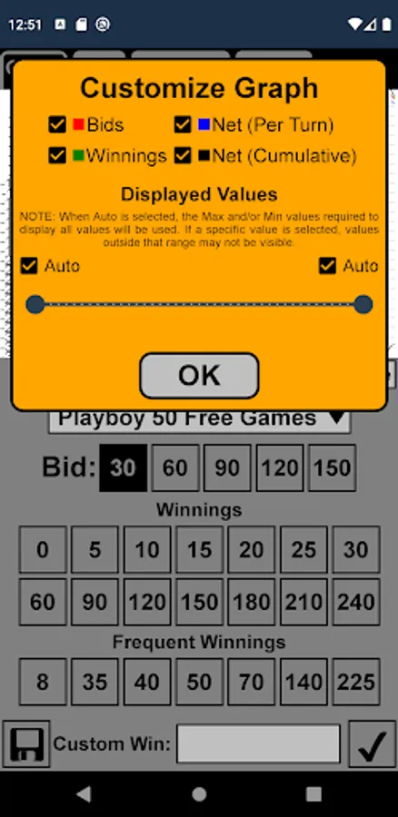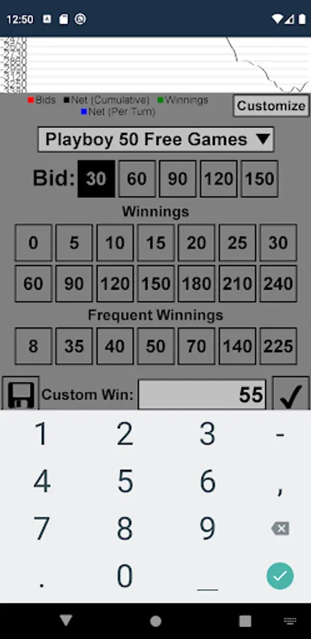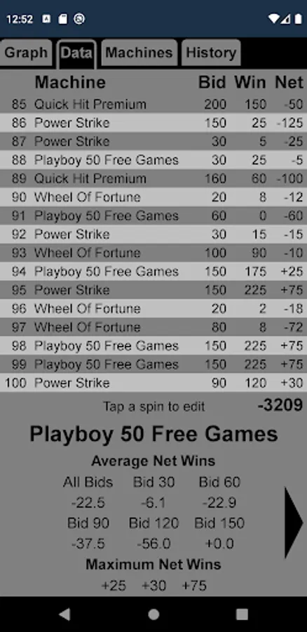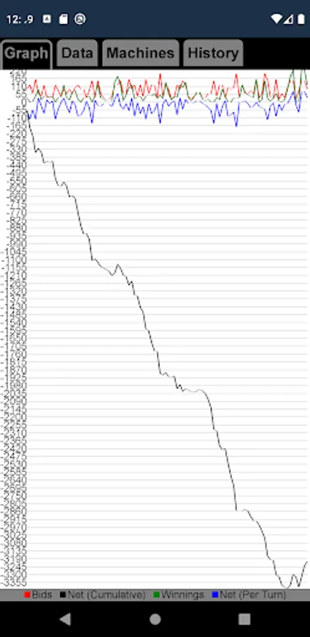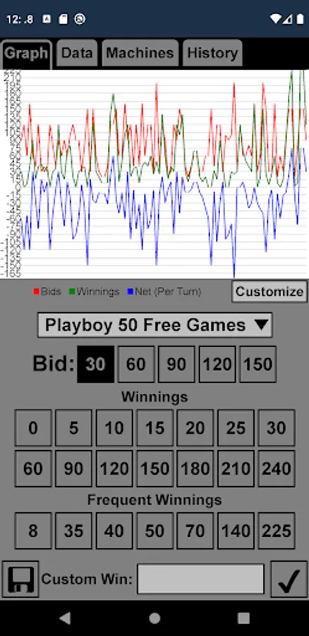 Slot Tracker allows you to enter your bids & winnings while playing different slot machines. The app dynamically generates a graph & calculates your net winnings for both individual & cumulative spins. Because the graph may sometimes contain an individual value that is much larger than all others, or may look ugly when displaying certain fields at the same time, you are given the option to customize the graph by selecting which fields and/or the minimum/maximum values displayed. You can create custom machines by specifying a name, the possible bids, and the win increment. You can also save the number of spins & total net winnings to keep a history of how much you played & how much you won for each visit. While entering data (bid & winnings), the app creates buttons for default winnings & most frequent winnings, as well as the option to enter custom winnings (winnings for which a button has not yet been created). The generated graph contains the values for (depending on what you have selected in the customization options) Bids, Winnings, Net (Per Turn), and/or Net (Cumulative), and can be easily & quickly temporarily zoomed in on by pressing & releasing the graph image. Slot Tracker is not designed for any specific type of slot machine (it does not keep track of whether a spin triggered a special feature or bonus), it is generic in that it takes the basic input of bids & wins, and generates net winnings, a graph & other data.