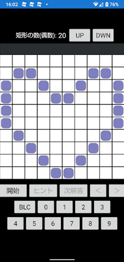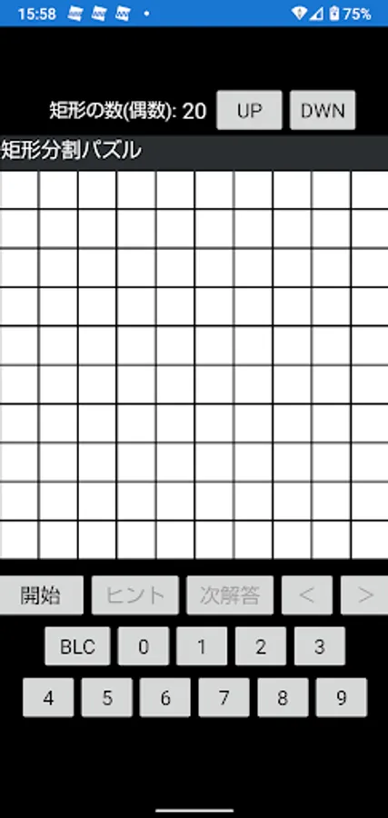 When you tap the "Start" button on the screen, numbers are automatically placed in the "number of rectangles" shown at the top of the screen, randomly selected, to create a puzzle. The number of rectangles is 2 to 50, and can be specified with the "UP" and "DWN" buttons at the top of the screen. The sum of the placed numbers is 100 (=total number of squares).