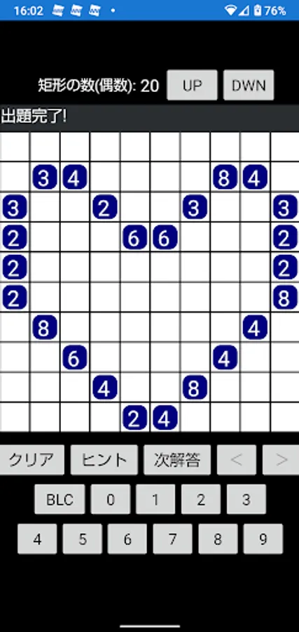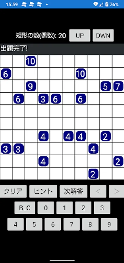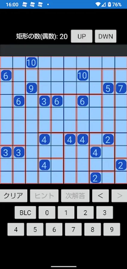 This application is a puzzle that divides a board consisting of 10x10 squares into rectangles (quads) based on the numbers written on some of the squares. A rectangle contains one cell with a number, and the same number of cells as the number are assembled into a rectangle. Ultimately, it is a success if the board can be divided into rectangles without gaps or overlaps.
