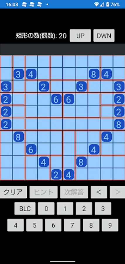 The rectangles that divide the board are formed by continuous squares. The numbers displayed in the squares represent the number of squares that make up the rectangle. One rectangle must contain one number cell. To create a rectangle, first tap the rectangle's vertices and squares with predictions. At this time, the square will be colored red. Next, swipe with your finger from that square to the diagonal vertex square. Then, according to it, a red marker that is almost the same size as the square appears and moves through the squares, and all the squares in the rectangle formed by the marker's destination square and the starting square change to light blue. The number of squares in the rectangle you have formed is displayed at the top of the screen. Exit. The marker disappears and a pale blue rectangle with a red border is drawn.