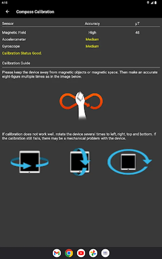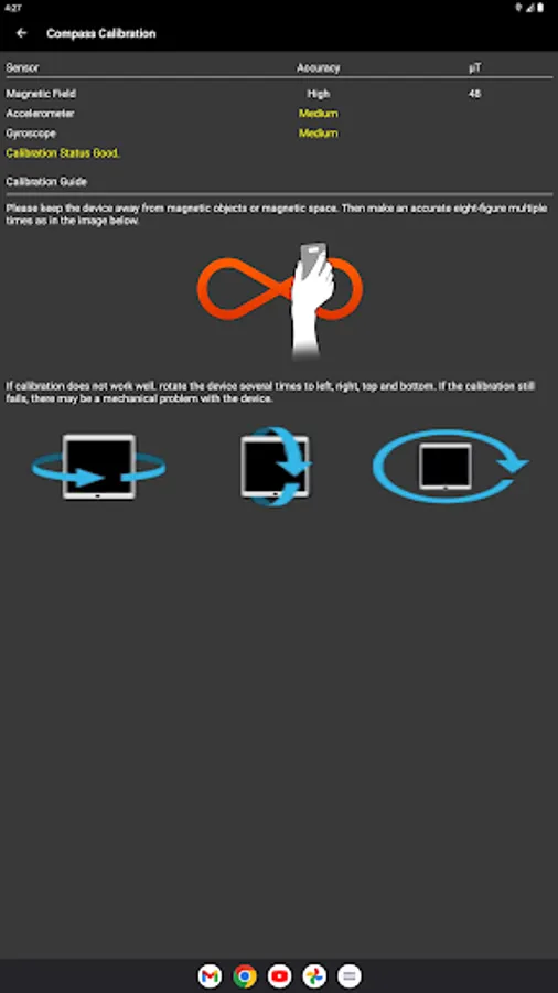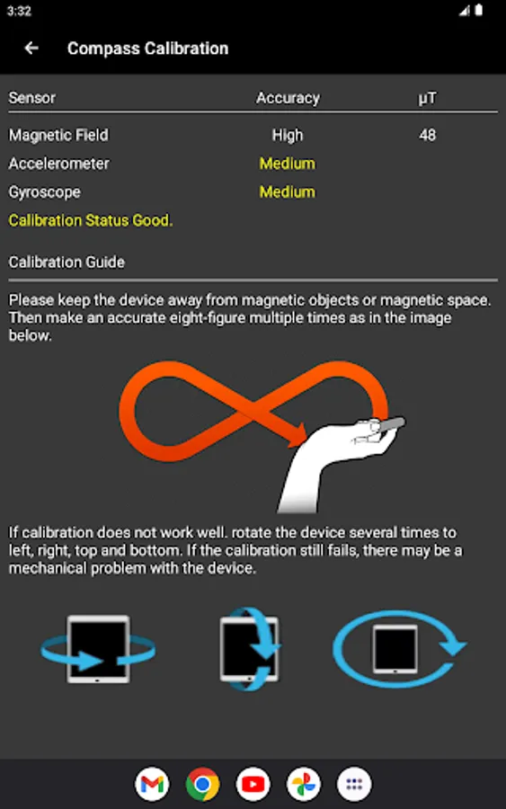 This digital compass utilizes the gyroscope, accelerator, magnetometer, and gravity sensors of your device. Please ensure that your device has at least the accelerator and magnetometer sensors for proper functioning of the compass.