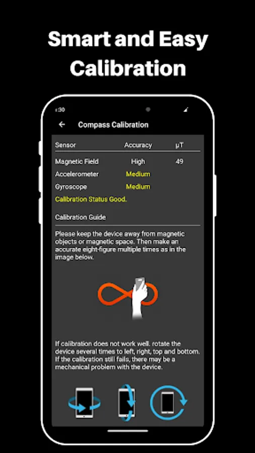 * If you encounter direction errors, calibrate your phone by waving it in a figure 8, two or three times or calibrate the device by flipping and moving the phone back