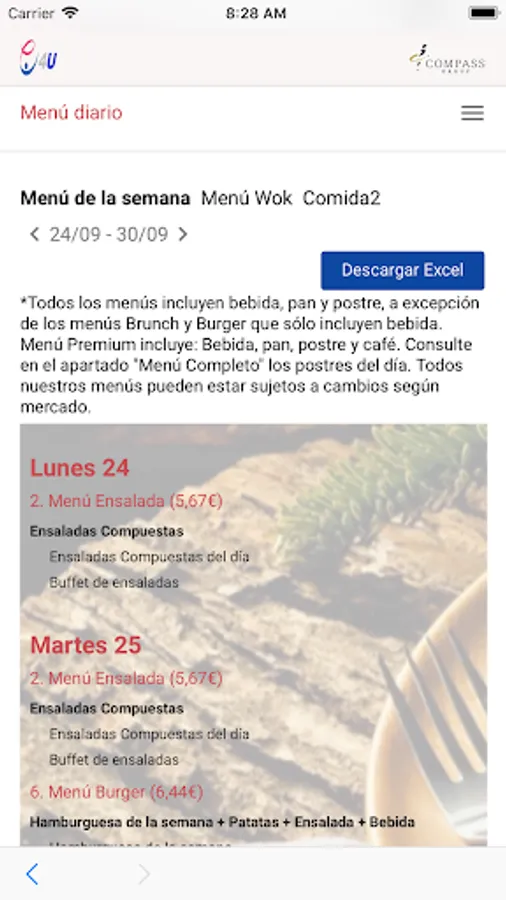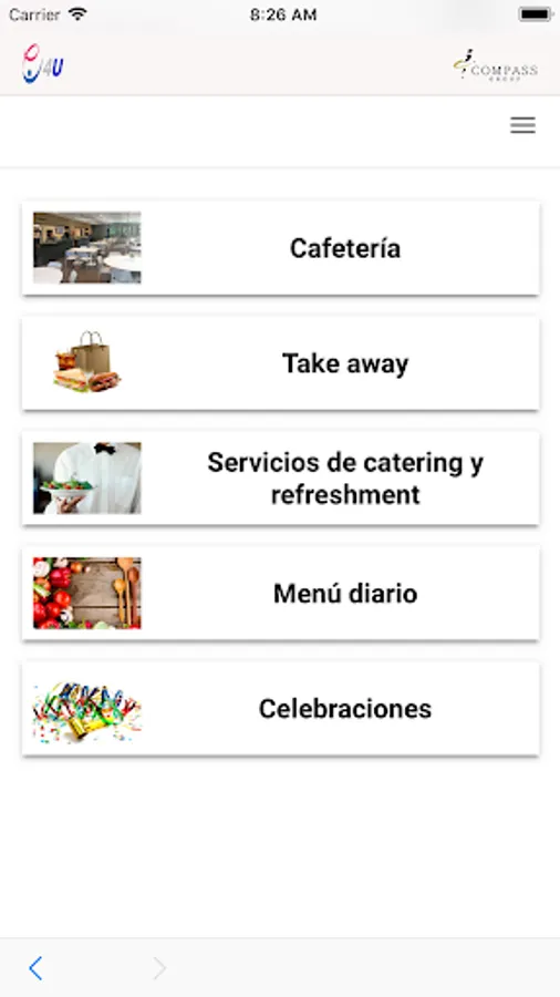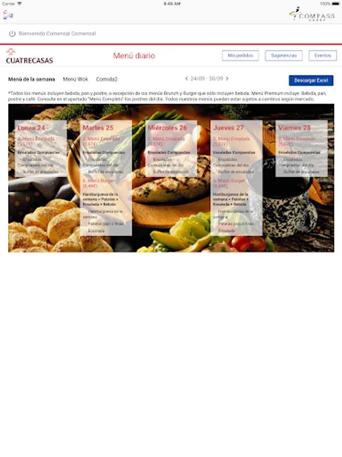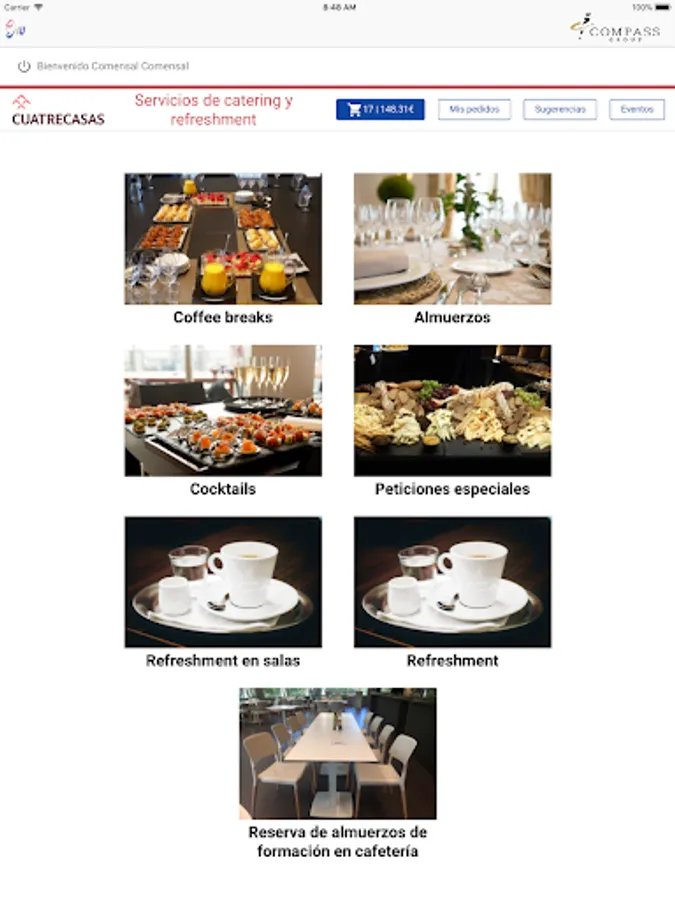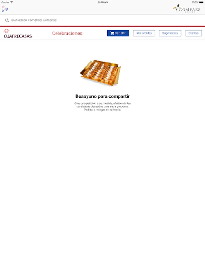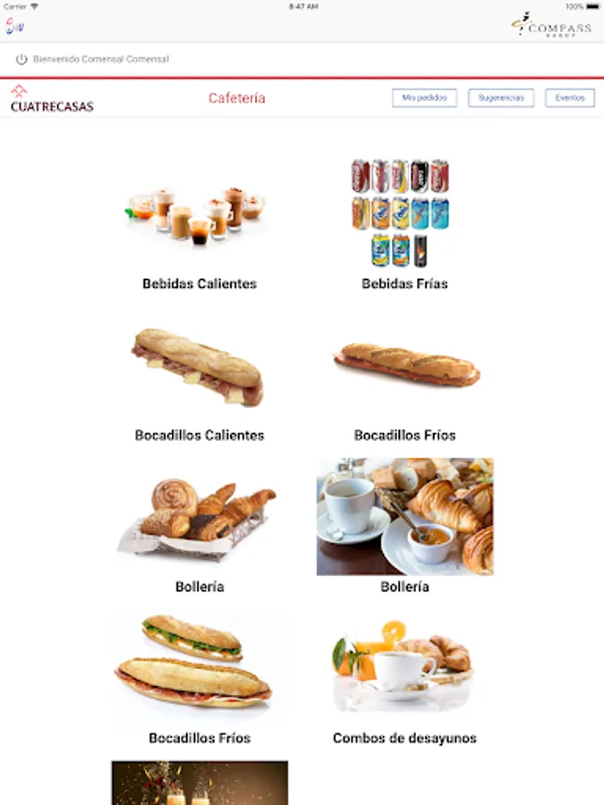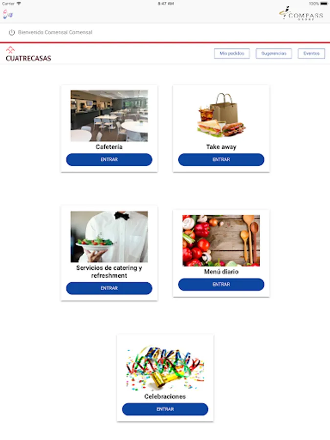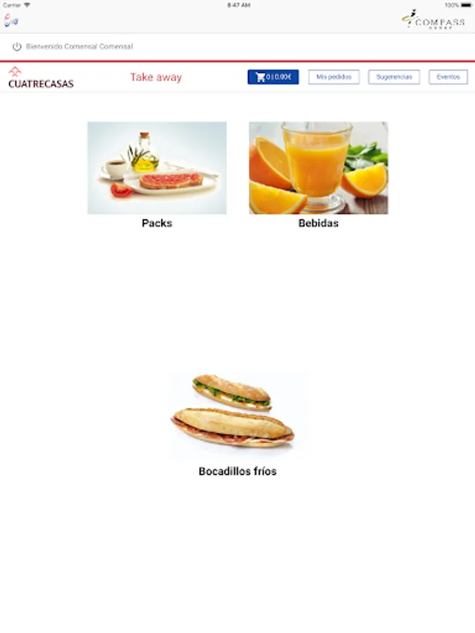 E4U is the application of Compass Group Spain used in services to dining rooms in our customers. It allows the diner to generate a daily menu order or a take away in the cafeteria. It also unifies the orders of catering for room or offices made by the secretaries of the client.