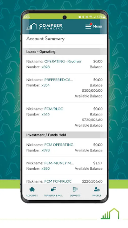 Compeer Financial offers clients the ability to view Compeer account balances, see recent transactions and account details, pay bills, initiate transfers to/from loans, and ability to make payments remotely to a line of credit using remote deposit.