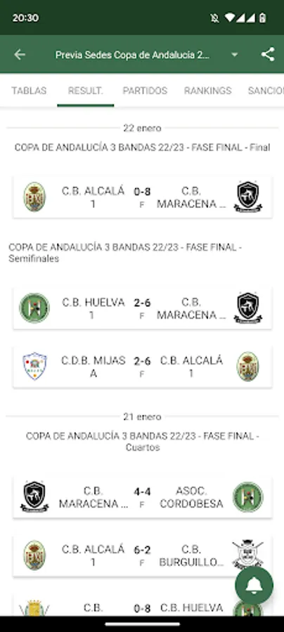 Official application of the Andalusian Billiards Federation. Consult all the results, competitions and rankings of the federation, as well as the detailed data of its clubs and athletes.