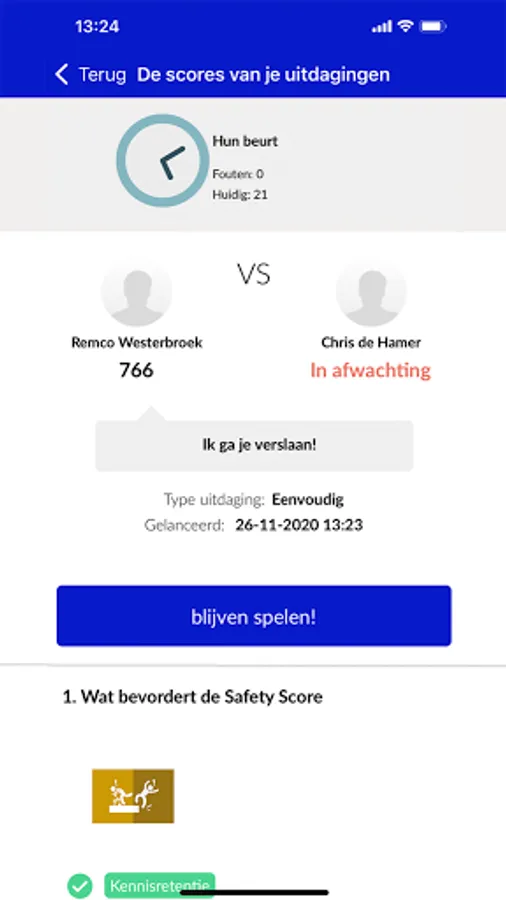 In the Rockpit Game you play with an opponent for relevant topics, such as safety on the construction site with our Safety Score. You can challenge an opponent yourself or you are challenged. You play in battles of 7 questions each time. You play the battle when it suits you. After the battle you will immediately gain insight into who won and which questions you answered correctly and incorrectly. We have added short supporting information for each question, so that you can always view additional knowledge for a specific question. A battle consists of a random set of selected questions, so you always get a different combination of questions. This gives you more variety and the relevant knowledge is offered randomly. This makes the game varied and ensures that you get more questions on subjects where you score less well. This way you absorb the knowledge faster and it becomes ready knowledge.
