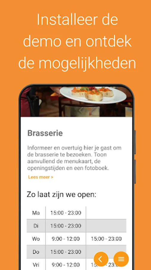 Show all opening times in the VakantieApp. We also create one overview page with all opening times, for example the reception, the swimming pool and the restaurant. Do you also want to show the opening hours of the restaurant on the information page of the restaurant? No problem, we'll arrange. We show the information where it is useful for your guest.