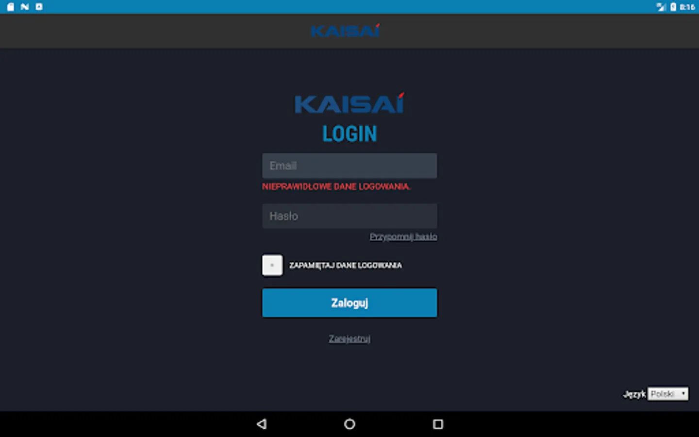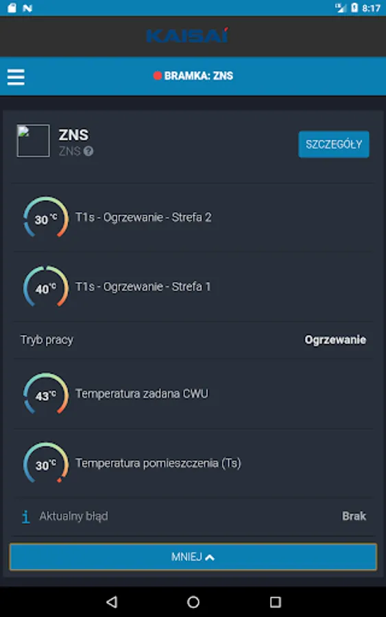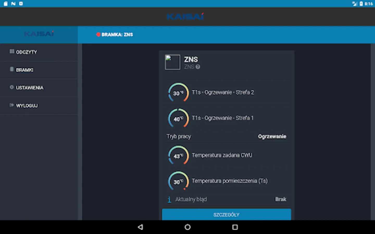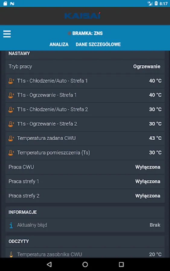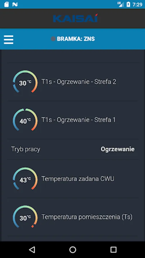 The application enables connection with Kaisai heat pumps equipped with the Remote Service Supervision module - Kaisai ZNS