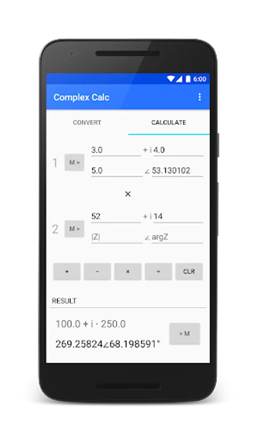Complex Calc is an ad-free application used to find a complex number as a result of addition, subtraction, multiplication, and division of two complex numbers.