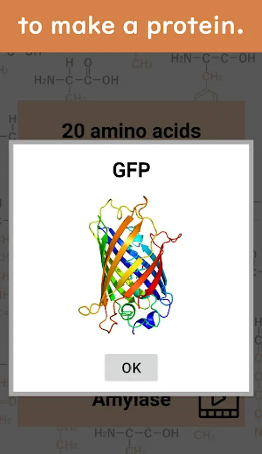 Furthermore, you can connect the amino acids you have answered to create proteins. Assemble real proteins such as glucagon, GFP, rhodopsin, and amylase. In addition, the ability to view the 3D structure of the protein you have created in the 3D viewer is also attractive. I myself particularly like the 3D structure of GFP.
