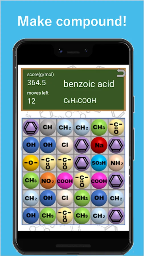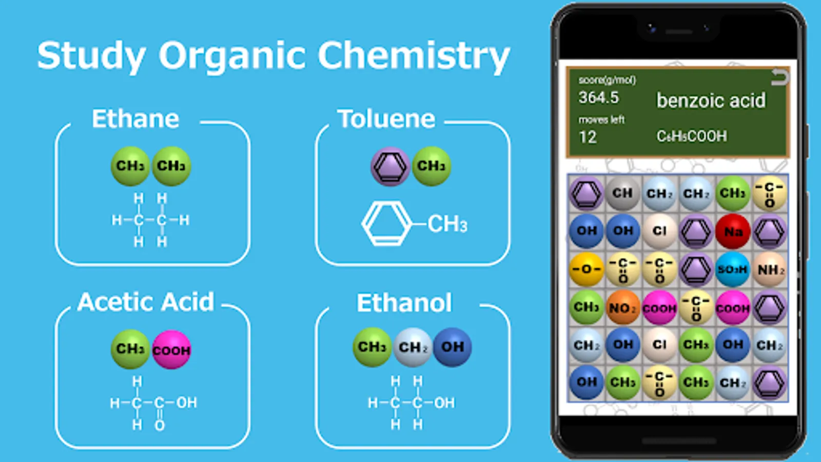 Connect functional groups to create organic compounds. Compete for high scores based on molecular weight, gaining an intuitive understanding.