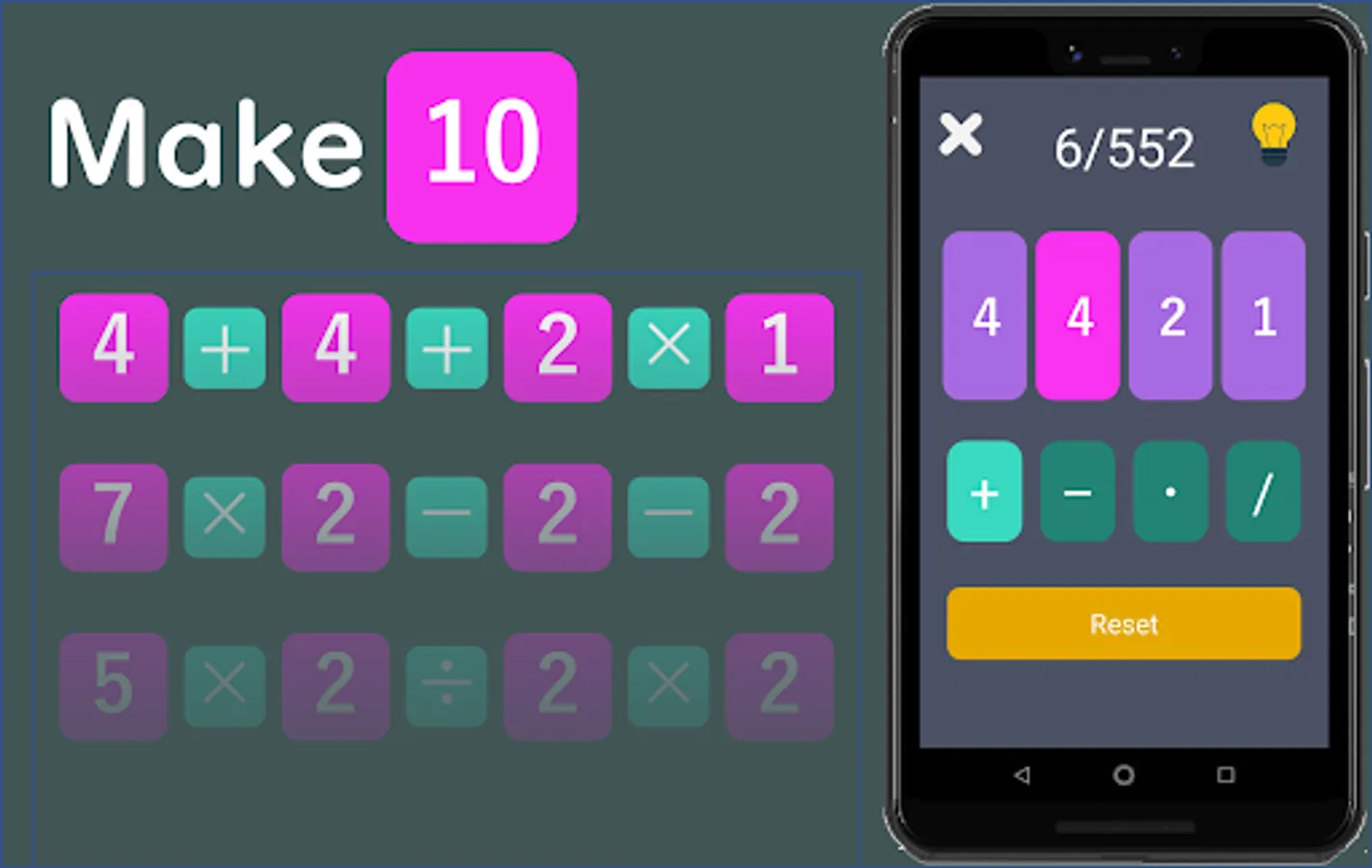Make 10 by combining four numbers and addition, subtraction, multiplication, and division. This is a game that you used to play with car license plates. It is a math quiz called Ten Puzzle, Make10, etc.