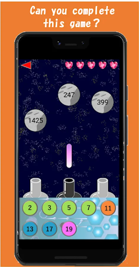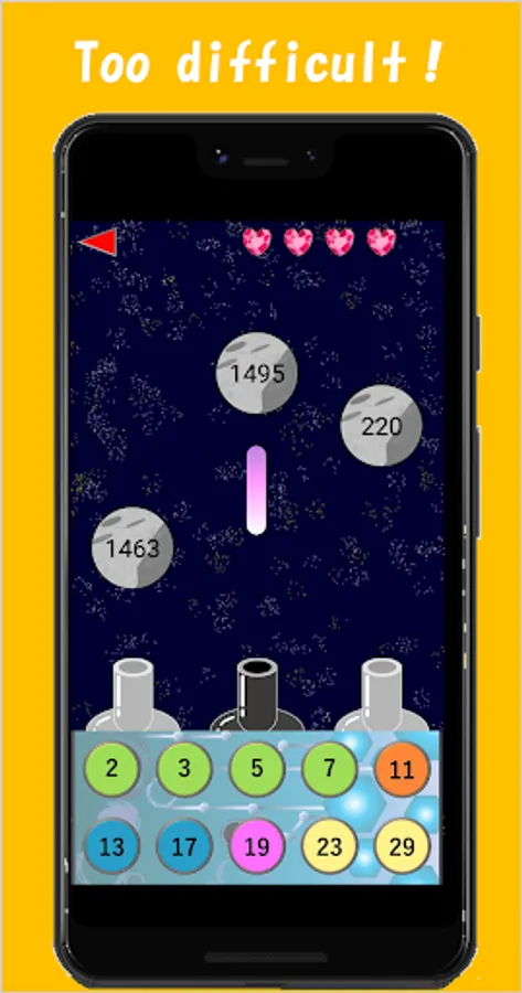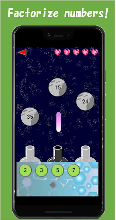 Put the button of a prime number, emit the ray and divide the number written in meteorites! This app specifies the factors of the number by using a factoring algorithm. Destroy all meteorites quickly not to be damaged by them. This is a calculation game that can improve your calculation and memorization skills by turning an arithmetic/math quiz into a game.