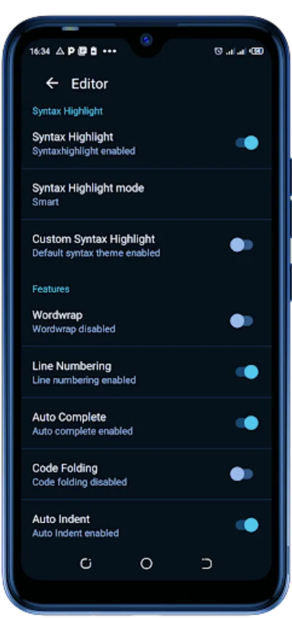 - Custom color themes to customize every aspect of the editor such as header , background , lines, status and action bar etc.
